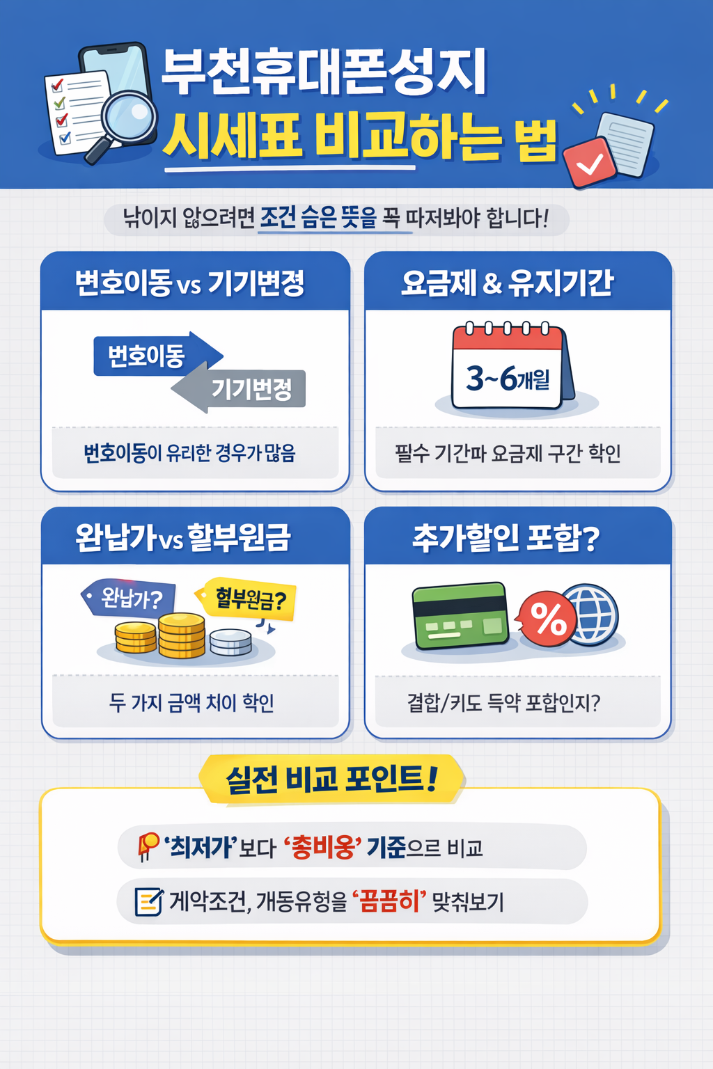 부천 휴대폰 성지 | 시세표 비교로 싸게 사는 법같은 아이폰·갤럭시인데도 매장마다 가격이 다른 이유는 단순한 “기기값”이 아니라, 지원금 구조와 개통 조건 차이에서 생기는 경우가 많습니다.이 글에서는 부천 휴대폰 성지 시세표를 기준으로, 초보도 실수 없이 비교할 수 있는 방법을 정보성으로 정리했습니다.📌 목차부천 휴대폰 성지란? 가격 차이가 나는 원리시세표 숫자 읽는 법(만원 단위)시세표 비교 시 반드시 조건을 맞춰야 하는 이유공시지원금 vs 선택약정, 무엇이 다른가?번호이동/기기변경 비교 핵심구매 전 체크리스트(호갱 방지)자주 묻는 질문(FAQ)1) 부천 휴대폰 성지란? 가격 차이가 나는 원리흔히 말하는 부천 휴대폰 성지는 “무조건 싸다”를 의미한다기보다, 개통 조건(요금제/약정/부가서비스/할인 적용..